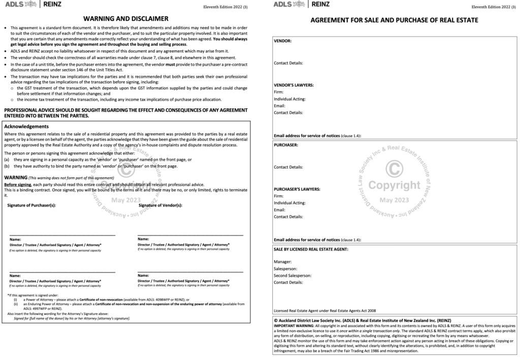 First thing to understand is that the SPA is the contract used to sell/purchase property in New Zealand. Every detail of the sale is presented in this contract, the front page of the SPA contains most of the important information, below is a copy of the front page which we will run through in detail.